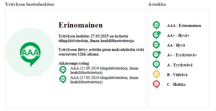 LPOnetin luottoluokitus on AAA – Erinomainen. LPOnetille toimitetussa raportissa todetaan, että yritykseen liittyy erittäin pieni maksuhäiriön riski seuraavien 12kk aikana. Yrityksen luokitus 27.03.2025 on laskettu tilinpäätöstiedoin, ilman henkilöluottotietoja.