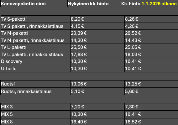 Tiettyihin kaapeli-tv-verkon maksukanavapaketteihin tulee pieniä hinnankorotuksia yleisestä kustannustason noususta johtuen. Korotus kuukausimaksuun on 0,06 – 0,50 euroa kanavapaketista riippuen. Uudet hinnat astuvat voimaan 1.1.2026. Muutokset eivät vaadi asiakkailta mitään toimenpiteitä. Mikäli sinulla on kysyttävää, otathan yhteyttä asiakaspalveluumme.